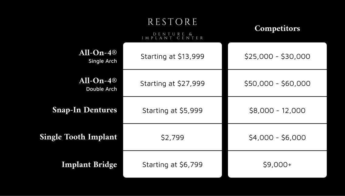This price includes dental implants, abutments, snaps, and the snap-in denture. It does not include the price of extraction.