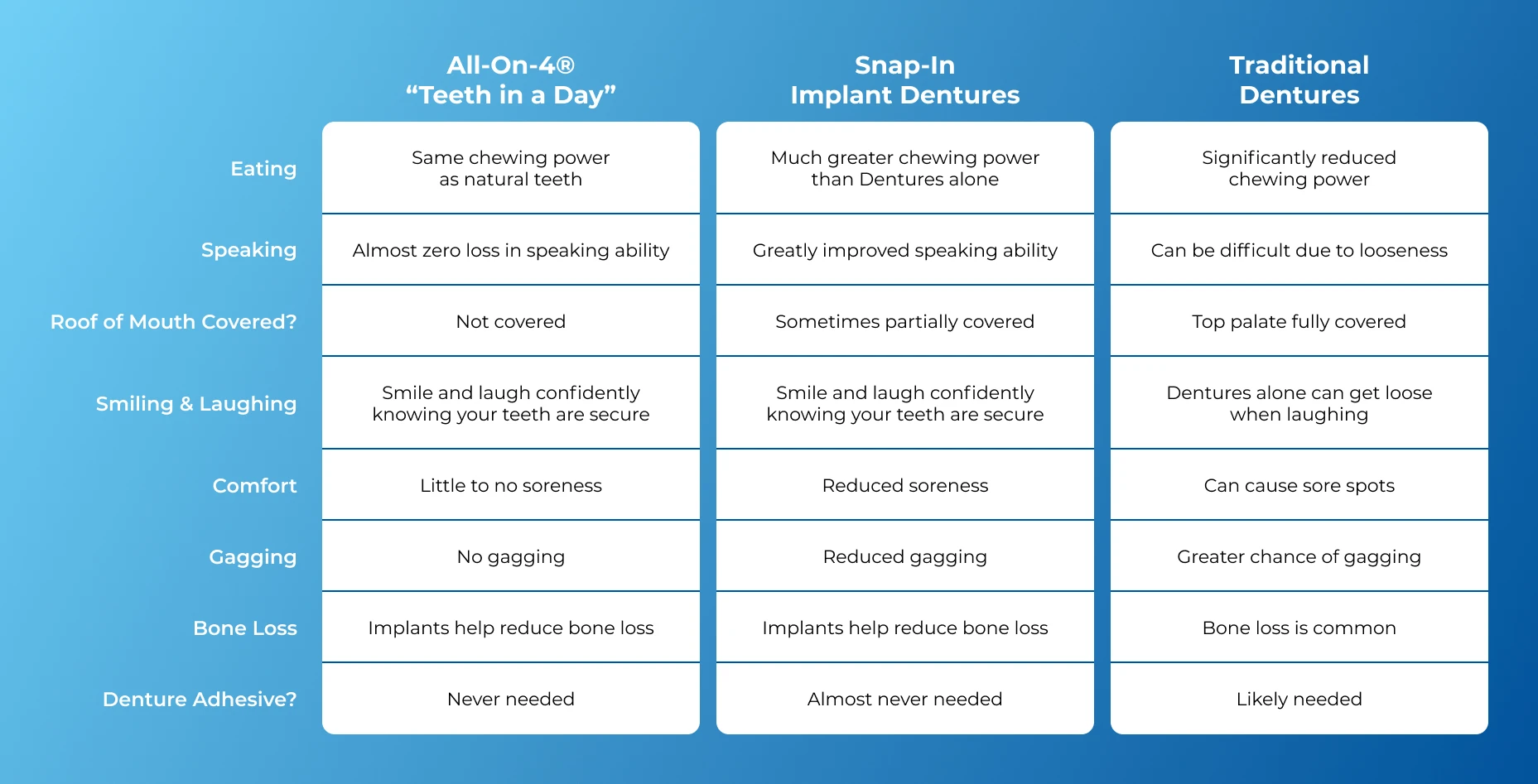 In this case, you should consider the All-On-4 procedure. Not all candidates for Snap-In Dentures will also be candidates to have the top palate removed.